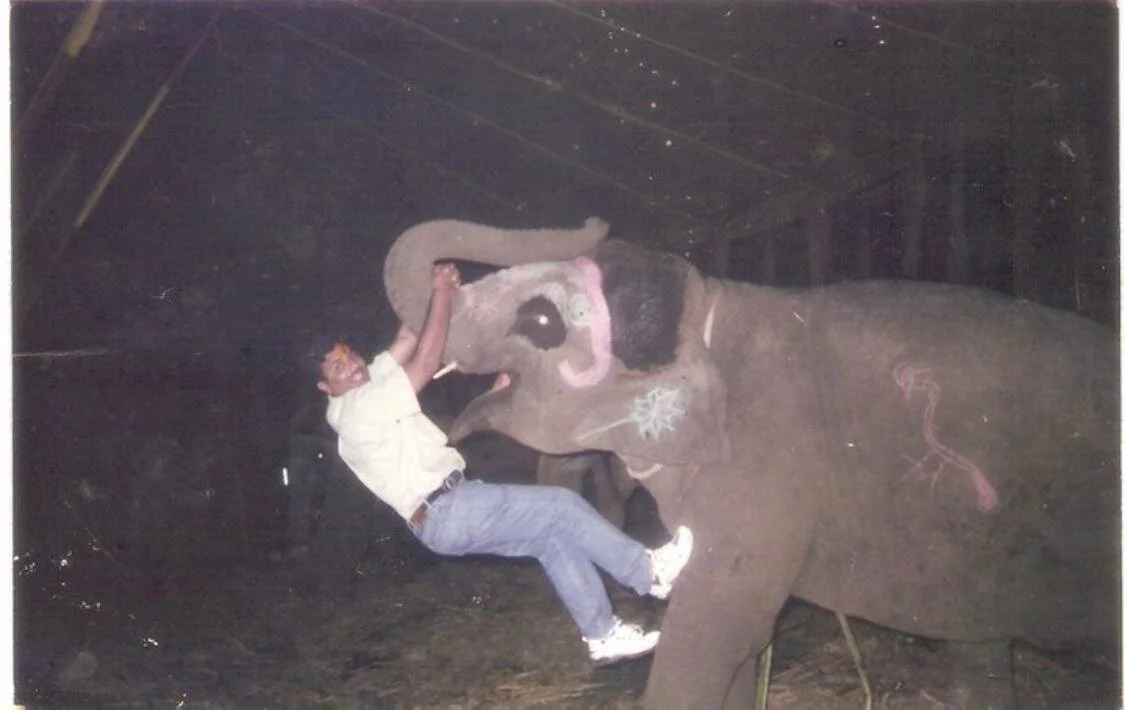 Old photo of Sujit Dilip, seen here playing with Nidya, the circus elephant