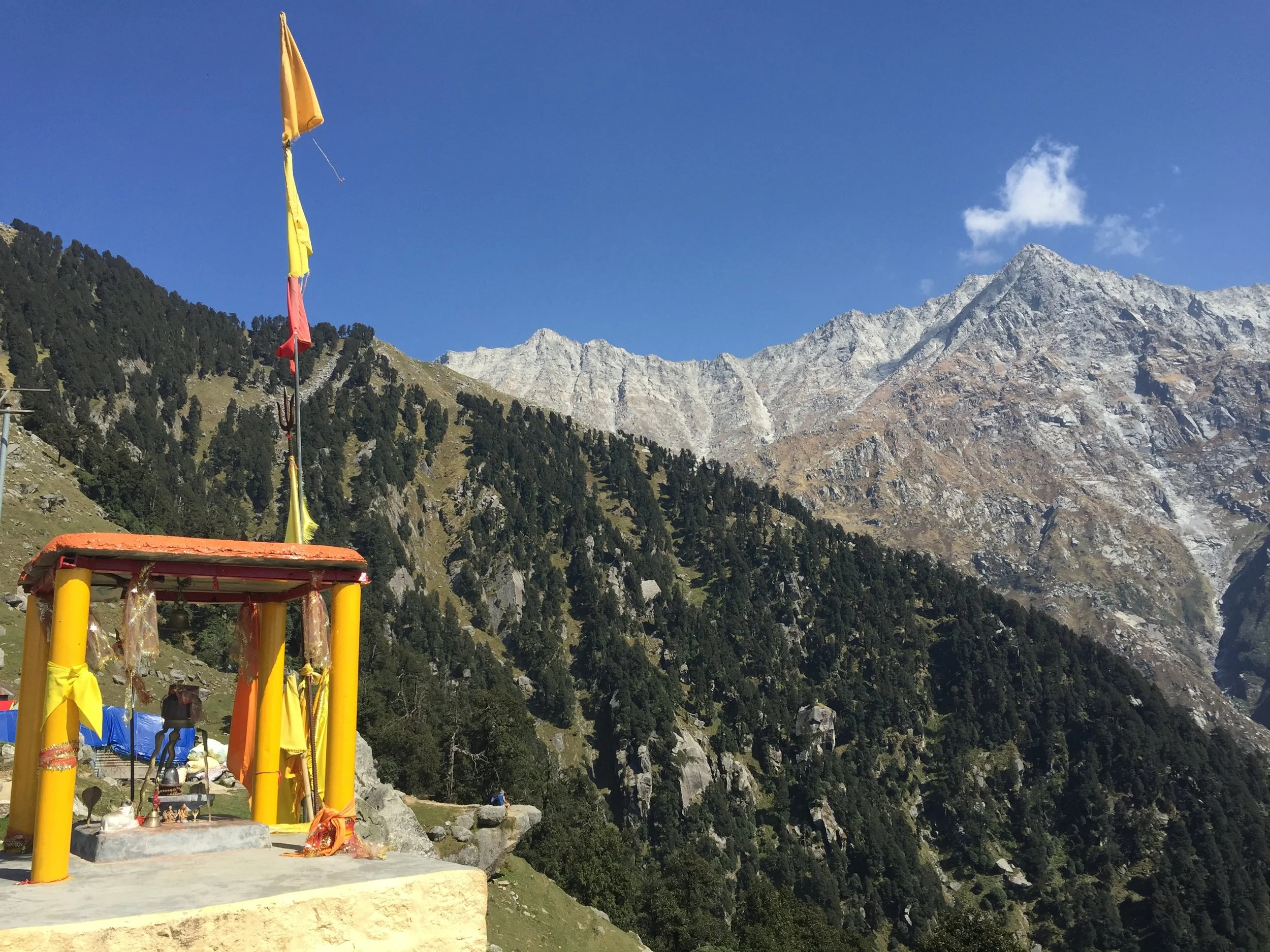 When my mother brings me to India, it is only on reaching Dharamsala that I finally feel at home. McLeodganj is one simple row of Tibetan cafés serving tsampa and salt tea. The night bus stops outside a general store, which has been run by Parsis since before Independence. I breathe a sigh of recognition. Home is in the dark red flash of monks’ robes on the narrow winding path to our mountain guest house, former summer palace of a maharaja. Its chowkidar—an old sage who likes to meditate in the forest before waking up the guests with the breakfast gong—is surrounded by kittens in his pine needle nest. There are stained glass windows in the bathroom.