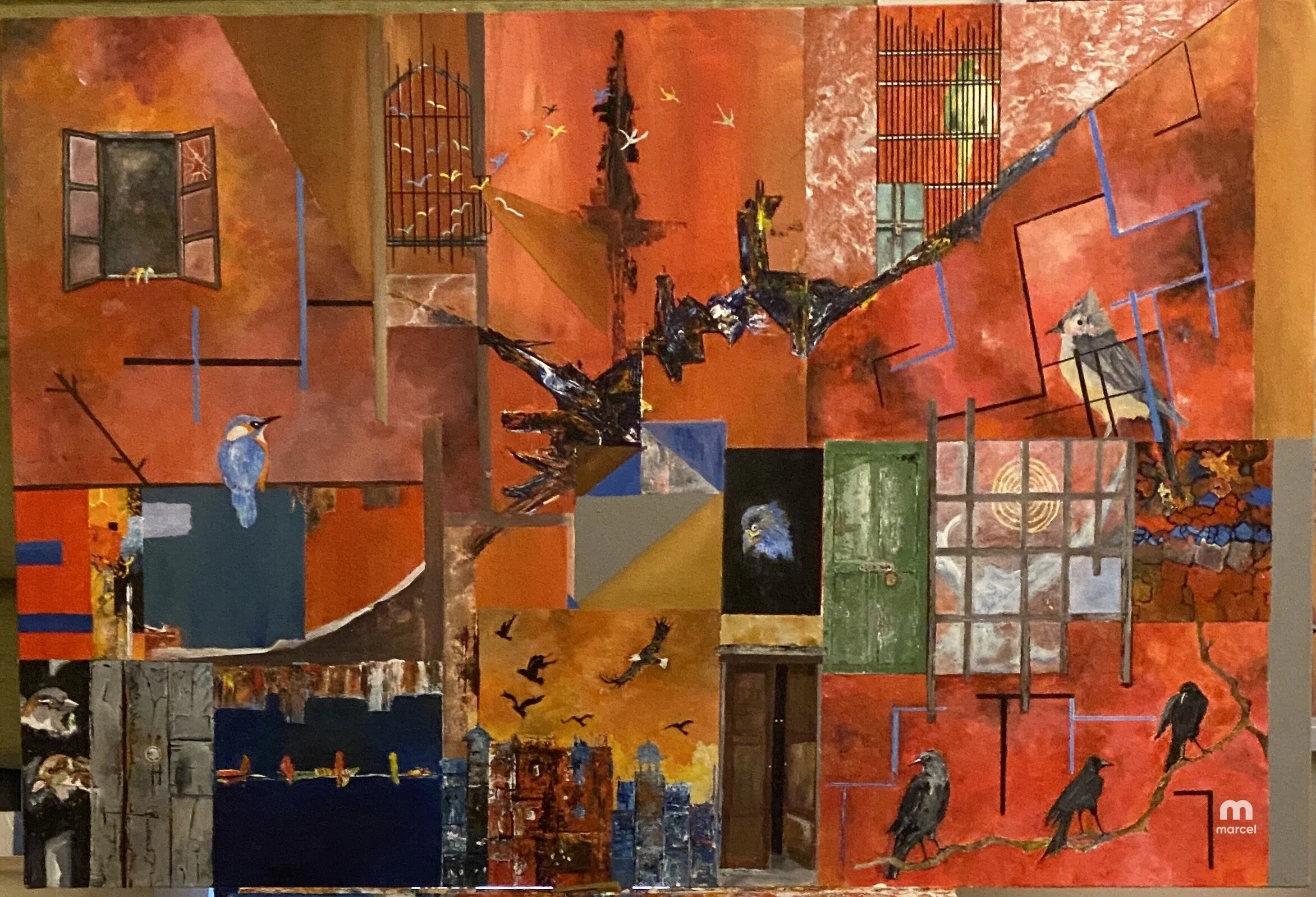 In my painting Shades of Life, there are sharp lines, fine points, jagged edges taking you through a journey (from birth), which is often cold and lonely. In the painting The Birds in Flight, the birds prance and fly across the canvas. Yet In this colourful world, there are predators and prisons.